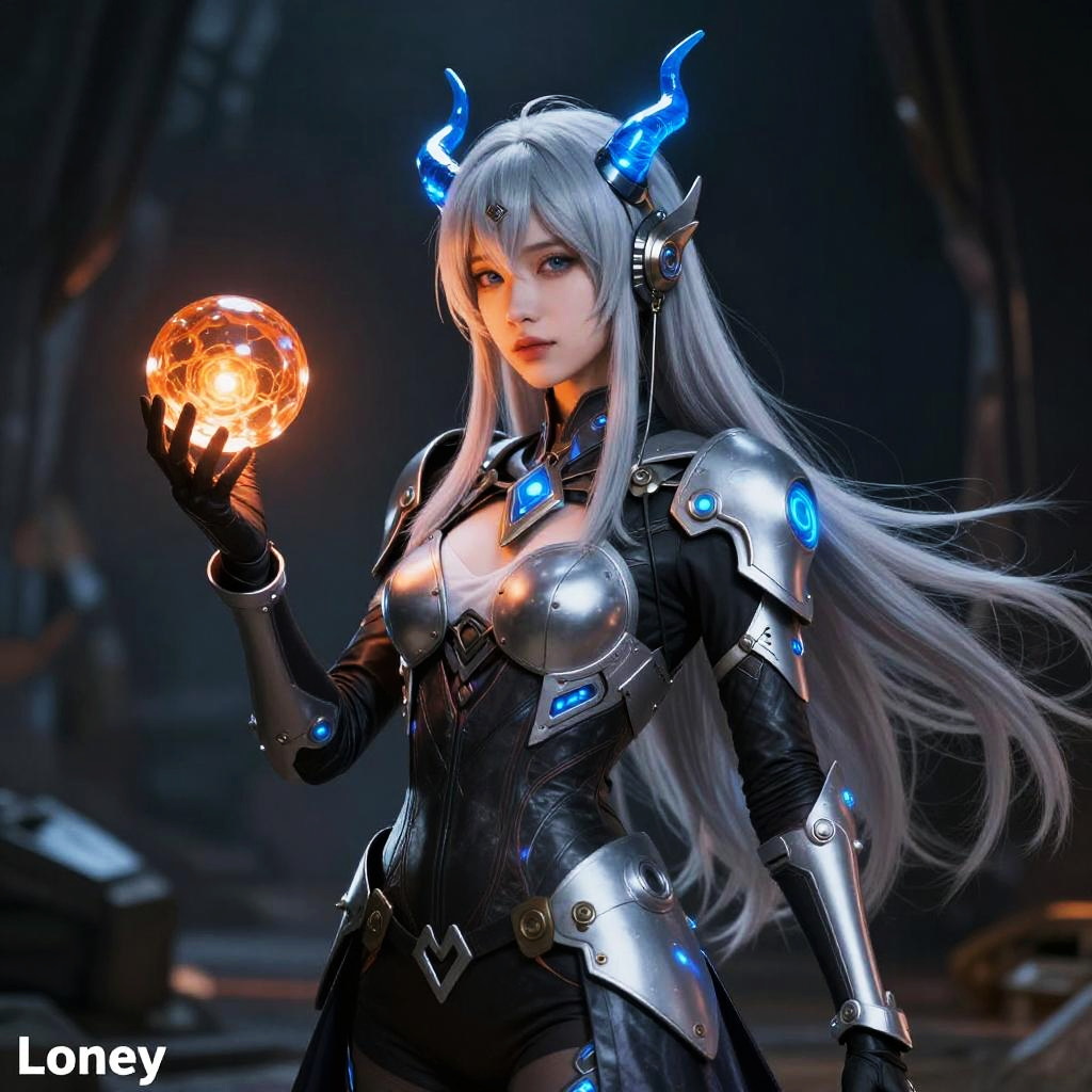 This is a digital CGI image of a fantasy character with a futuristic, cyberpunk vibe. She has long, silver hair, glowing blue horns, and multiple glowing blue accents on her black and silver armor. She's holding an orange, orb-like object in her right hand. The background is a blurry, dark, cavernous space. The image has a "Loney" watermark in the bottom left corner.