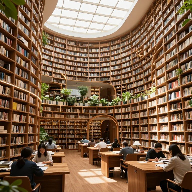 An expansive, multi-tiered library rendered in a hyper-realistic 3D style, featuring organic, spiraling bookshelves that ascend toward a luminous skylight, creating a serene atmosphere where natural light bathes rows of wooden desks occupied by studious individuals, all set against a backdrop of lush greenery and warm, inviting tones.