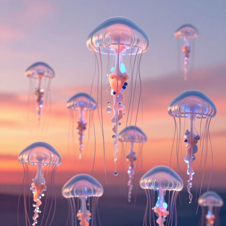 A surreal 3D-rendered scene depicts a colony of mechanical jellyfish ascending gracefully against a vibrant sunset backdrop, their translucent bodies illuminated by trails of liquid light that defy gravity, creating a mesmerizing blend of fantasy and digital artistry.