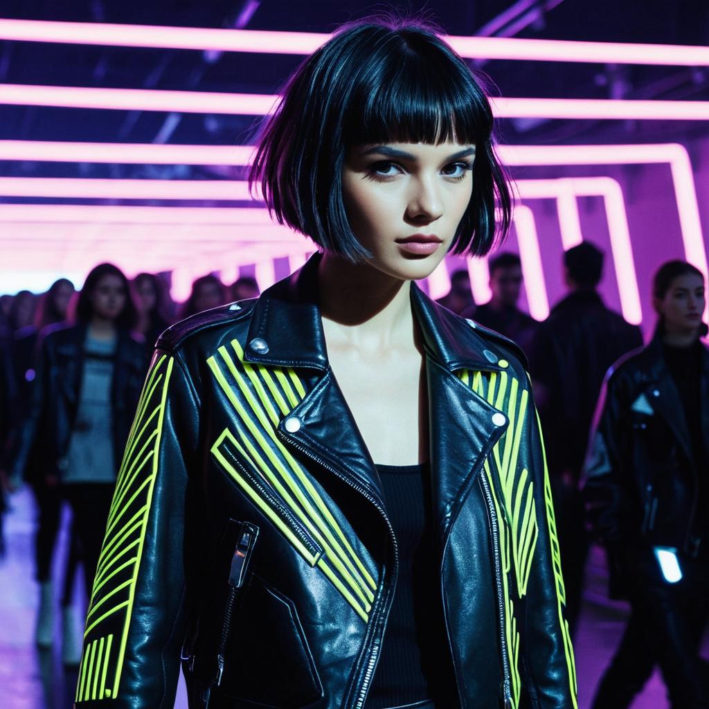 Sleek Ponytail hairstyle on fashion model, wearing leather jacket and silk blouse, in fashion runway, captured in fashion editorial style with neon ambient lighting.