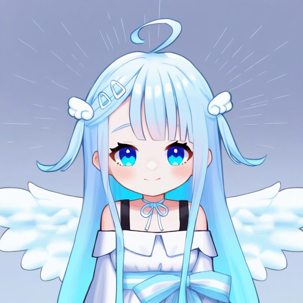 Digital illustration of a female virtual YouTuber character with long blue hair and blue eyes. She has angel wings, a small ahoge on top of her head, and wears a white off-shoulder dress with a light blue ribbon tied at the neck. The character has a serene smile and delicate hairclips shaped like small wings. The artwork style is anime-inspired and vibrant, depicting the character likely inspired by indie virtual YouTubers.