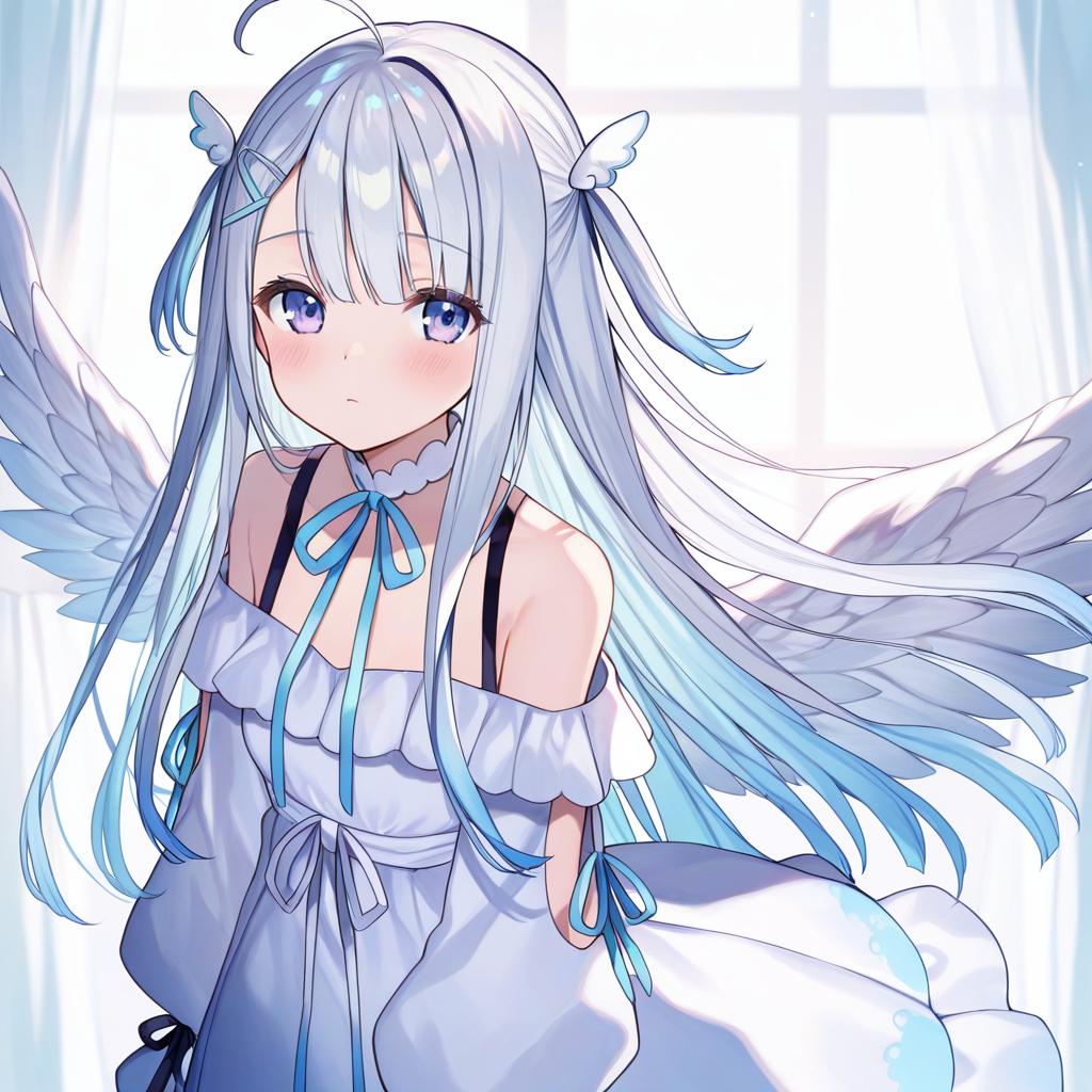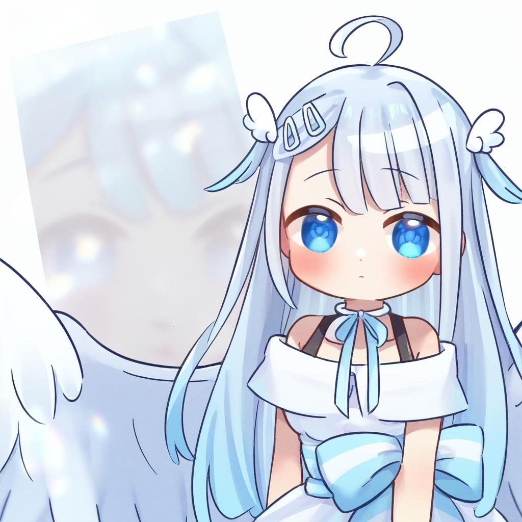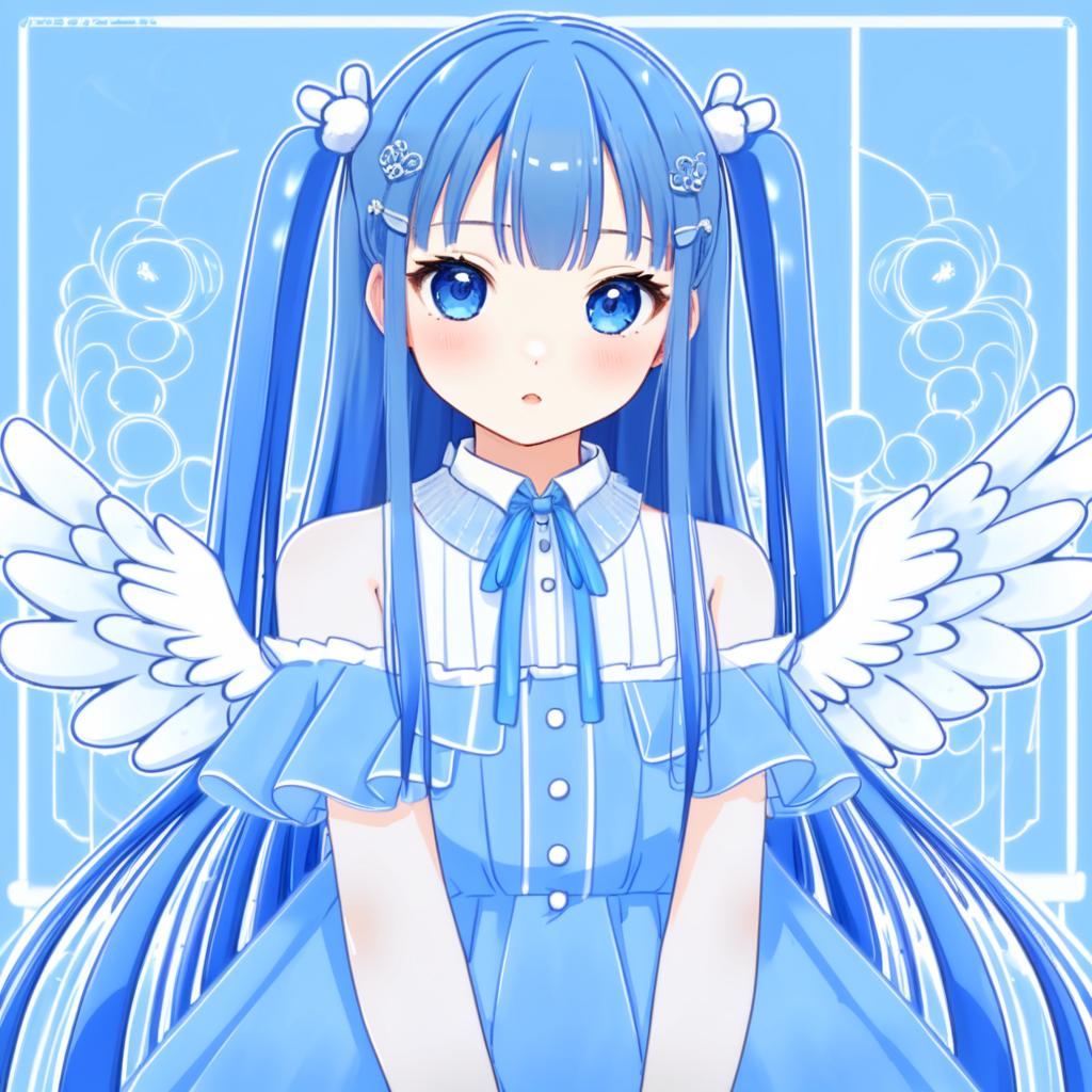 Amatsuka uto, indie virtual youtuber, 1girl, angel wings, blue eyes, blue hair, long hair, ahoge, two side up, hairclip, off-shoulder dress, bare shoulders, ribbon, virtual youtuber, virtual youtuber, by artist kekemotsu, leet