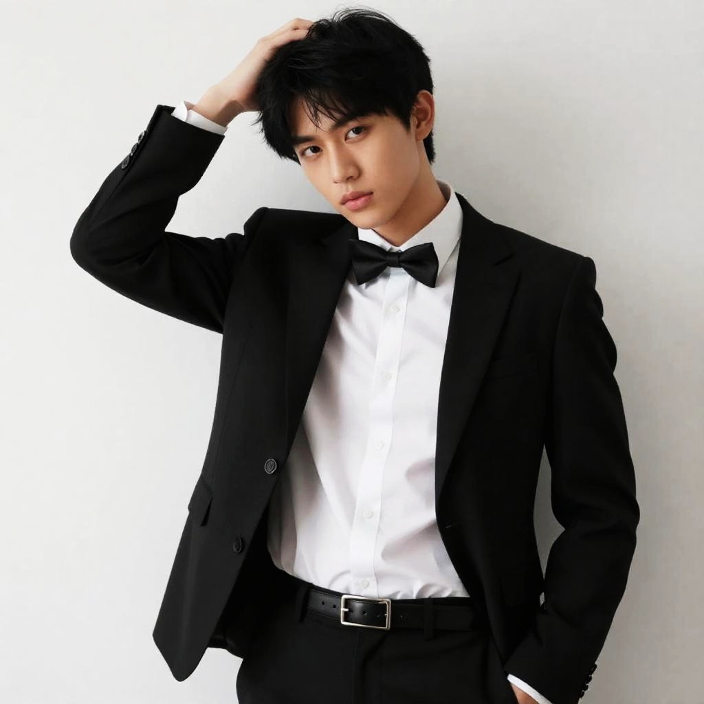 1boy, male focus, solo, sitting, black footwear, pants, black hair, black pants, shirt, from side, long sleeves, shoes, profile, full body, flower, short hair, collared shirt, crossed legs, jacket, white shirt, closed mouth, grey background, closed eyes, simple background, invisible chair