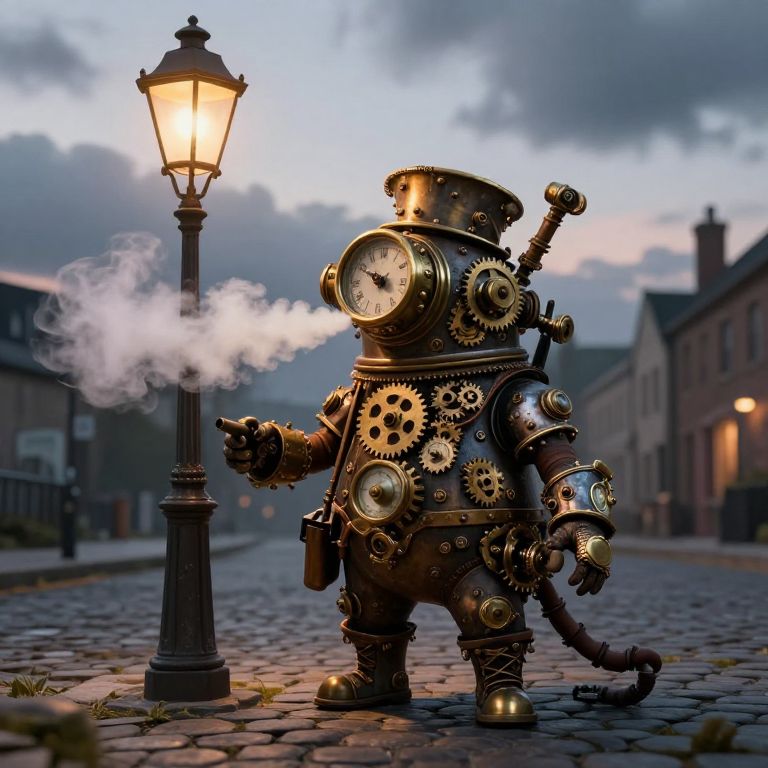 Steampunk clockwork robot with gears, steam, and a top hat stands on a cobblestone street beside a lit street lamp at dusk.