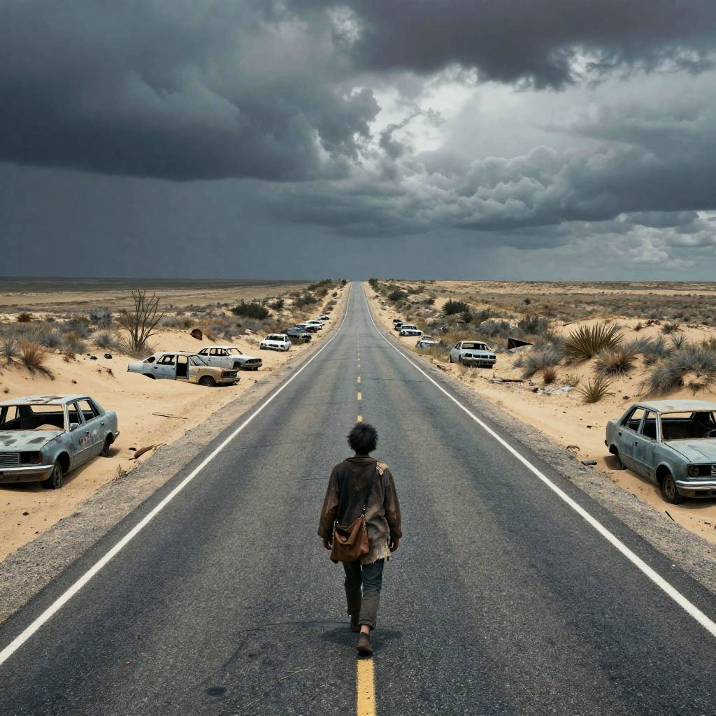 Post apocalyptic scene featuring a deserted highway stretching into a barren wasteland, abandoned vehicles half-buried in sand, dark clouds looming, a lone figure in tattered clothing walking