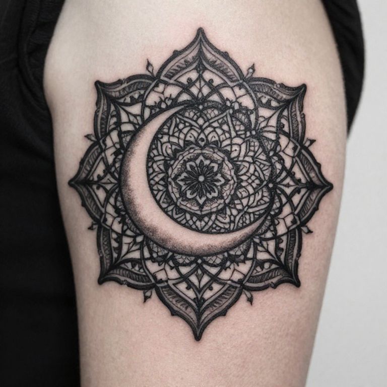 Create a tattoo design free online with a gothic-inspired mandala centered around a crescent moon, intricate lace-like details, subtle shading transitions, monochrome palette, artistic and symbolic composition, ideal for upper arm tattoo art.