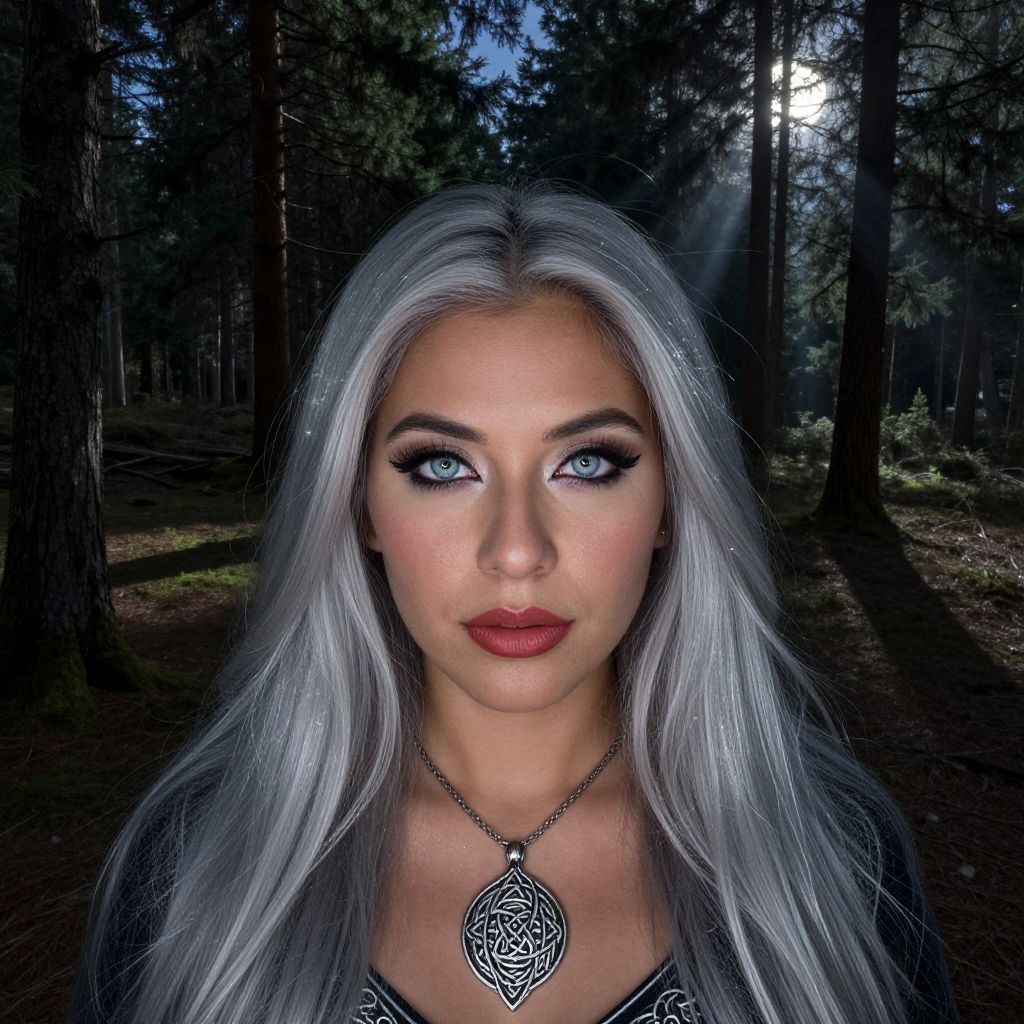 A portrait photograph showcases a Hispanic woman's captivating gaze with mesmerizing ice-blue eyes enhanced by delicate winged eyeliner. Her full rose-red lips gracefully contour her face, while intricate silver jewelry, including a prominent Celtic knot pendant, adorns her neck. The ethereal backdrop of an ancient forest clearing bathed in moonlight adds depth to the scene, where silvery beams filter through towering evergreen trees, casting dramatic shadows that highlight the contrasting textures of the landscape. From a unique aerial perspective, her long, silver hair appears woven with starlight, subtle reflections shimmering on her skin, creating an air of mystery and serenity that beckons viewers to uncover the depths of her soul.