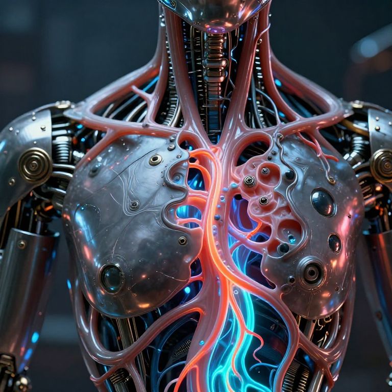 This is a highly detailed, digital CGI artwork depicting a futuristic, robotic human figure with exposed mechanical and biological elements. The robot's chest is prominently featured, showcasing a shiny, metallic exterior with intricate wiring and circuitry. Red and blue glowing, vein-like structures mimic human arteries and veins, running across the chest and down the torso. The background is dark and blurred, emphasizing the illuminated, bioluminescent elements of the robot's anatomy. The image combines elements of sci-fi and medical illustration, highlighting the fusion of organic and mechanical systems.