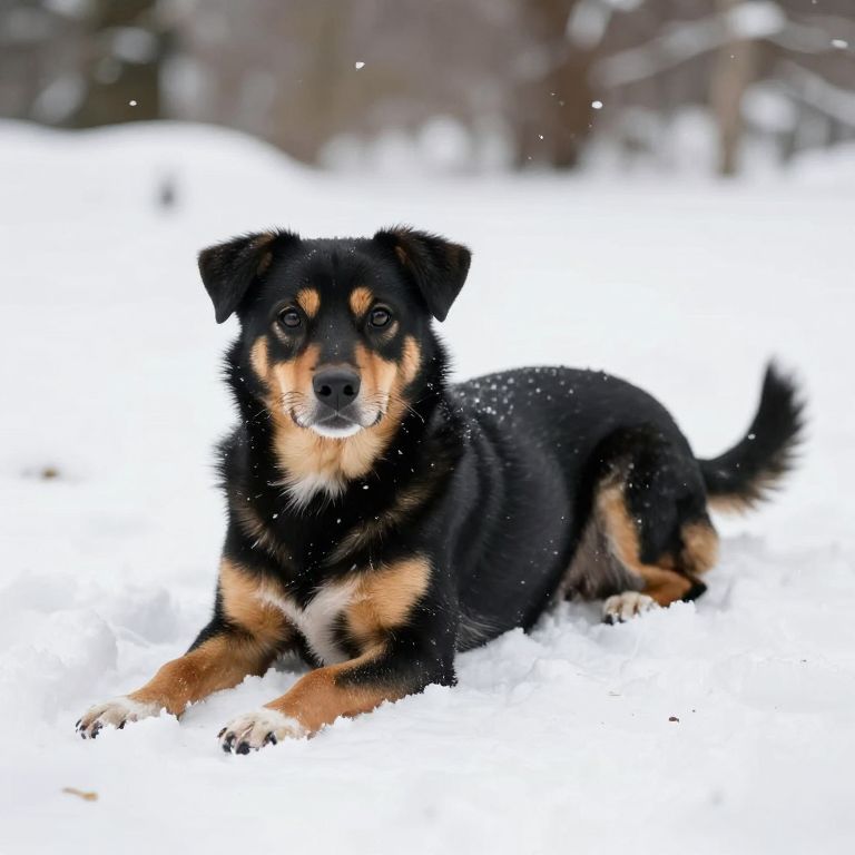 Photograph of a medium-sized, black and tan dog with a fluffy coat, lying in the snow. The dog has a black face with tan markings around the eyes and muzzle, and white fur on its chest. It has a friendly expression with dark, attentive eyes. The background is a blurred, snowy landscape with bare trees, creating a wintery, serene setting. Snowflakes are visible in the air, adding to the cold, wintry atmosphere. The dog's black tail is bushy and slightly curled. The snow is pristine and white, contrasting with the dog's dark fur.