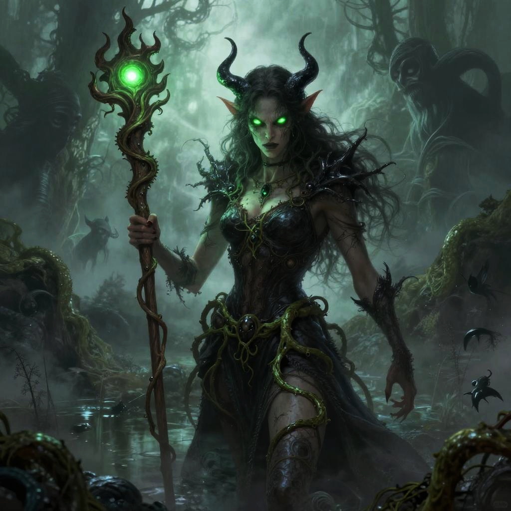 Evil druid art showing a malevolent nature witch with glowing green eyes, holding a staff entwined with venomous vines, standing in a foggy swamp, dark spirits swirling around, highly detailed fantasy illustration with a dark and mystical vibe