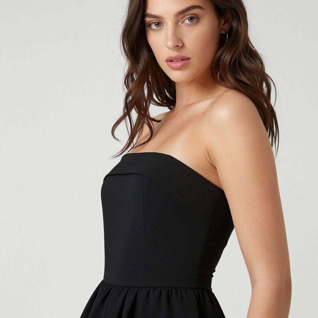 Photograph of a young woman with fair skin and long, wavy dark brown hair, wearing a strapless, black, fitted dress that cinches at the waist. She has blue eyes, subtle makeup, and wears small, dark earrings. Her expression is neutral, and she is slightly turned to her right, showing her bare shoulder. The background is completely white, making her the focal point. The lighting is even, highlighting her smooth skin and the texture of her dress. The style is modern and minimalistic.