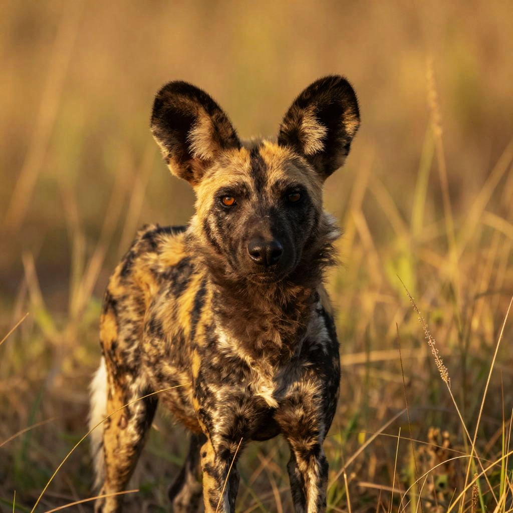 Photograph of an African Painted Dog standing in a dry, grassy savanna. The dog has a distinctive coat of black, white, and tan patches, large pointed ears, and expressive brown eyes. Its fur appears short and slightly tousled. The background is a blurred mix of golden and brown grasses, with sunlight casting a warm glow on the scene. The dog's gaze is directed towards the camera, giving a sense of alertness and curiosity. The overall composition highlights the dog's striking coat patterns and natural habitat.