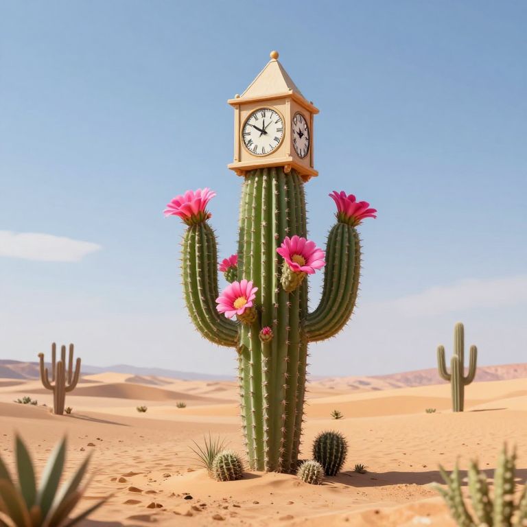 Photograph of a surreal desert scene featuring a cactus with a clock tower on top, resembling a sundial. The cactus has two arms adorned with vibrant pink flowers, and is centered in a sandy, sunlit desert. Surrounding the cactus are smaller cacti and desert plants, with a clear blue sky overhead. The clock face is white with black numbers and hands, and the clock tower has a beige roof. The overall composition blends natural and whimsical elements, creating a striking, imaginative landscape.