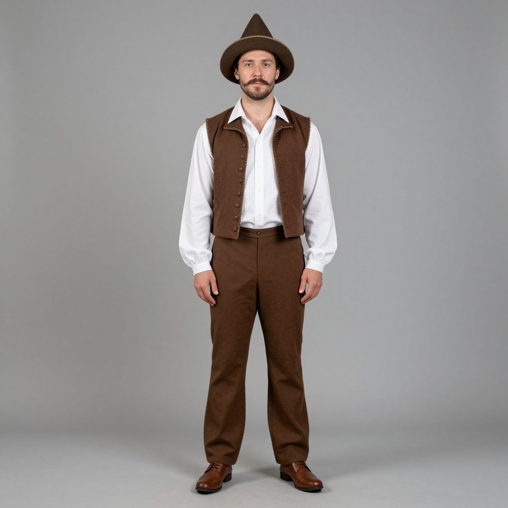 Renaissance theater costume, 1boy, male focus, solo, facial hair, hat, mustache, brown footwear, white shirt, standing, shirt, full body, long sleeves, looking at viewer, brown pants, pants, shoes, beard, vest