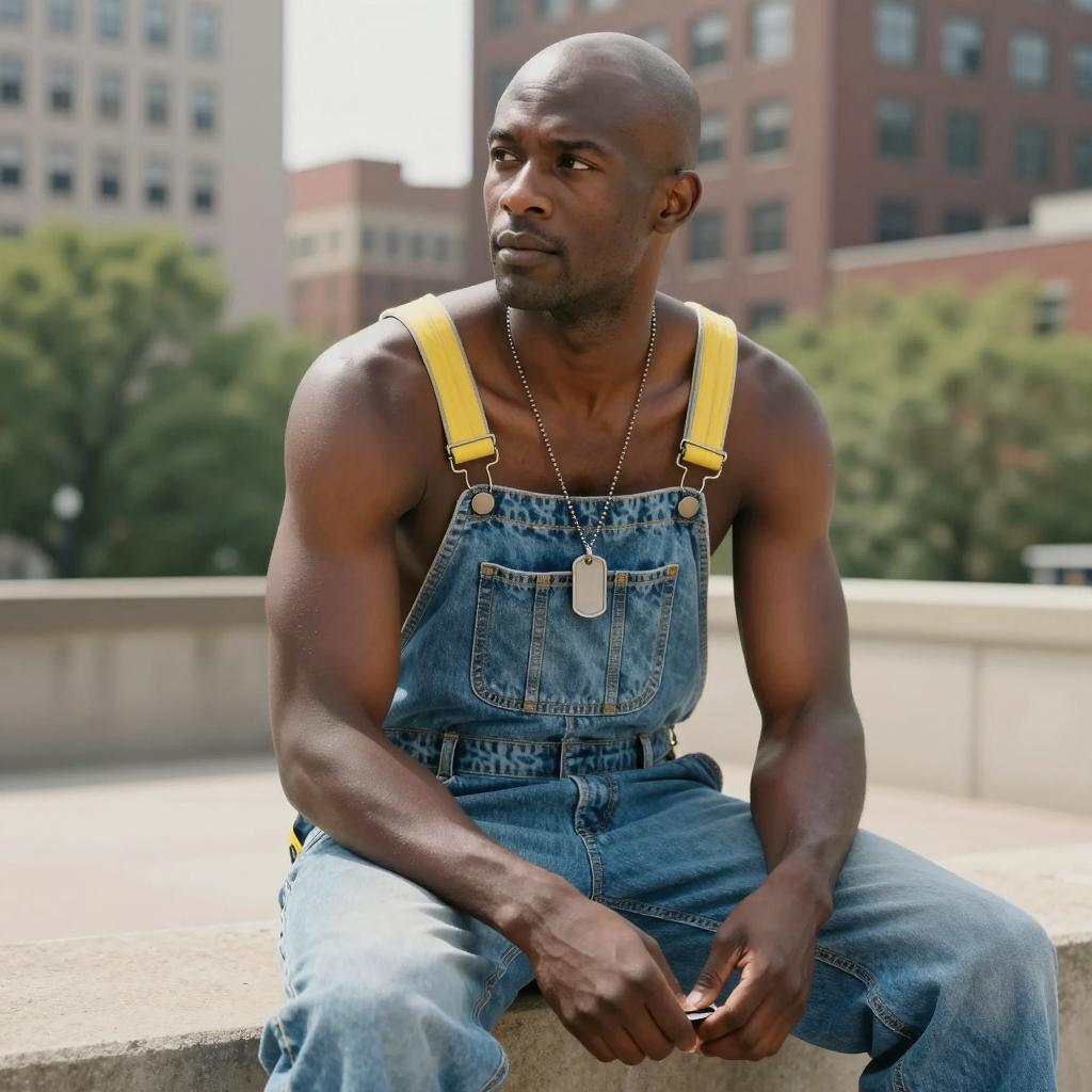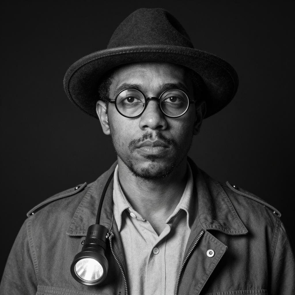 Black and white photograph of a Black man with short hair, wearing a striped shirt and dark pants, leaning forward to adjust a rifle in a wooden structure. His right hand holds the rifle, and his left hand reaches into the structure. The background includes a door and shelves with objects. The man's head is turned to the side, and his face is not visible. One wooden beam with a metal bolt is prominently in the foreground.