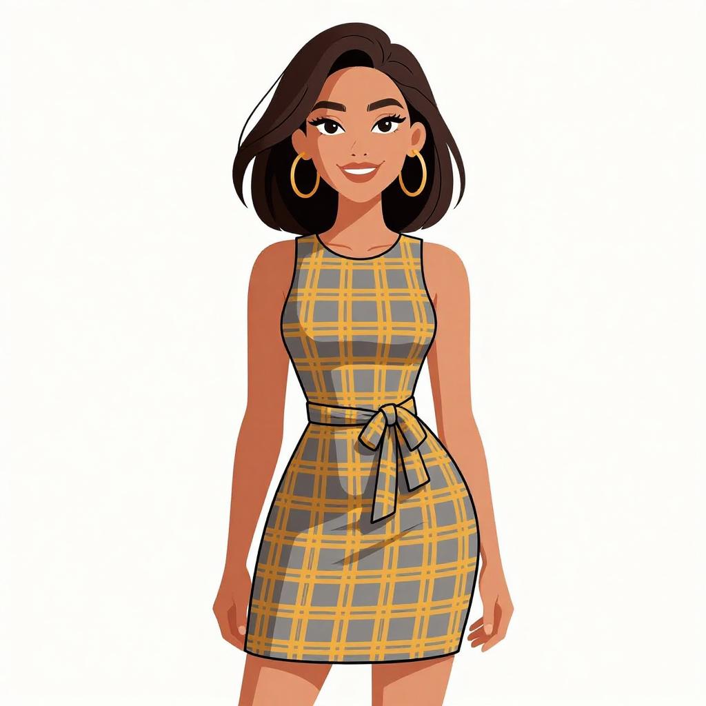 Digital illustration of a smiling woman with medium brown skin and black shoulder-length hair. She wears a sleeveless, form-fitting yellow and gray plaid dress with a tied waist and large gold hoop earrings. Her eyes are large and almond-shaped, and she has red lipstick. The background is plain white, highlighting her fashion-forward, confident look. The art style is vibrant and cartoonish, with bold lines and bright colors. The woman stands with a slight tilt, exuding a stylish and modern vibe.