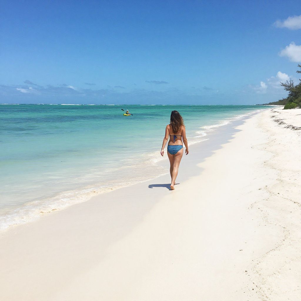 Photograph of a woman in a blue bikini walking on a white sandy beach, with a kayaker in the turquoise ocean under a clear blue sky.