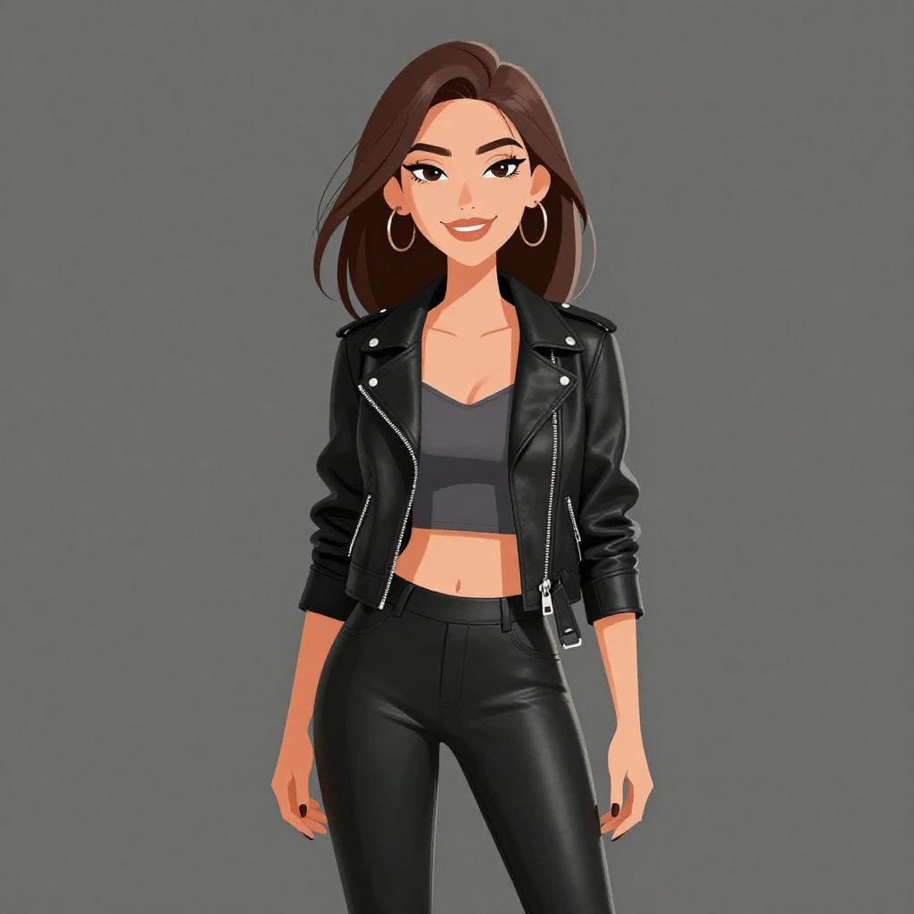 Woman with pretty face and pretty hair. smiling Woman, edgy, black leather biker jacket, asymmetrical zipper, grey fitted crop top, high-waist black faux leather leggings, slim fit. --sref 1467