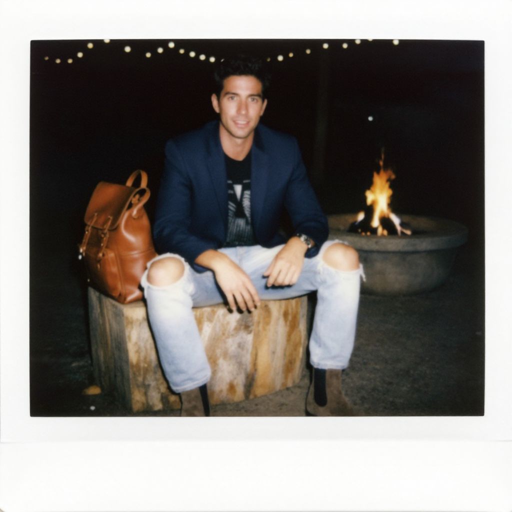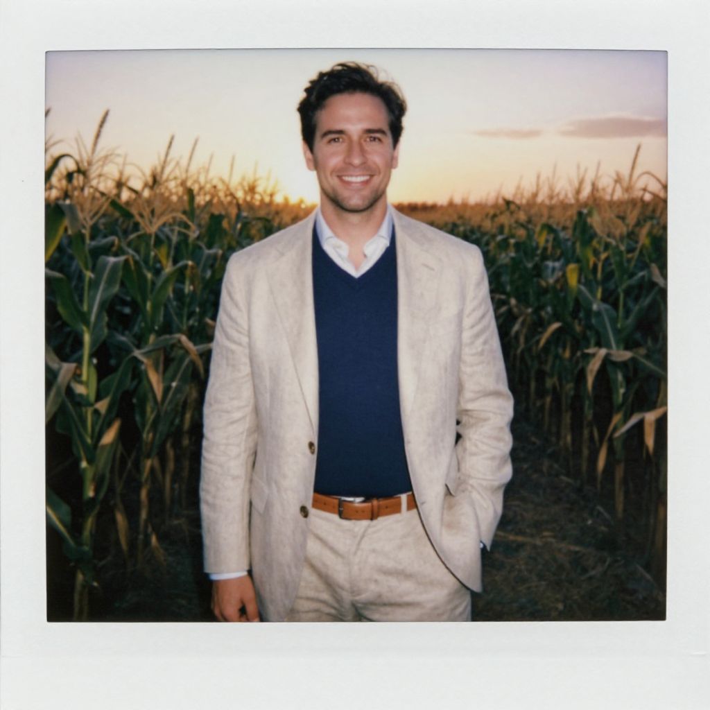 A man, light beige linen suit, navy V-neck cotton sweater, white dress shirt, tan loafers, matching tan leather belt, sunset over corn rows, warm golden light, relaxed smile, polaroid instant camera style. Man has masculine face and piercing eyes