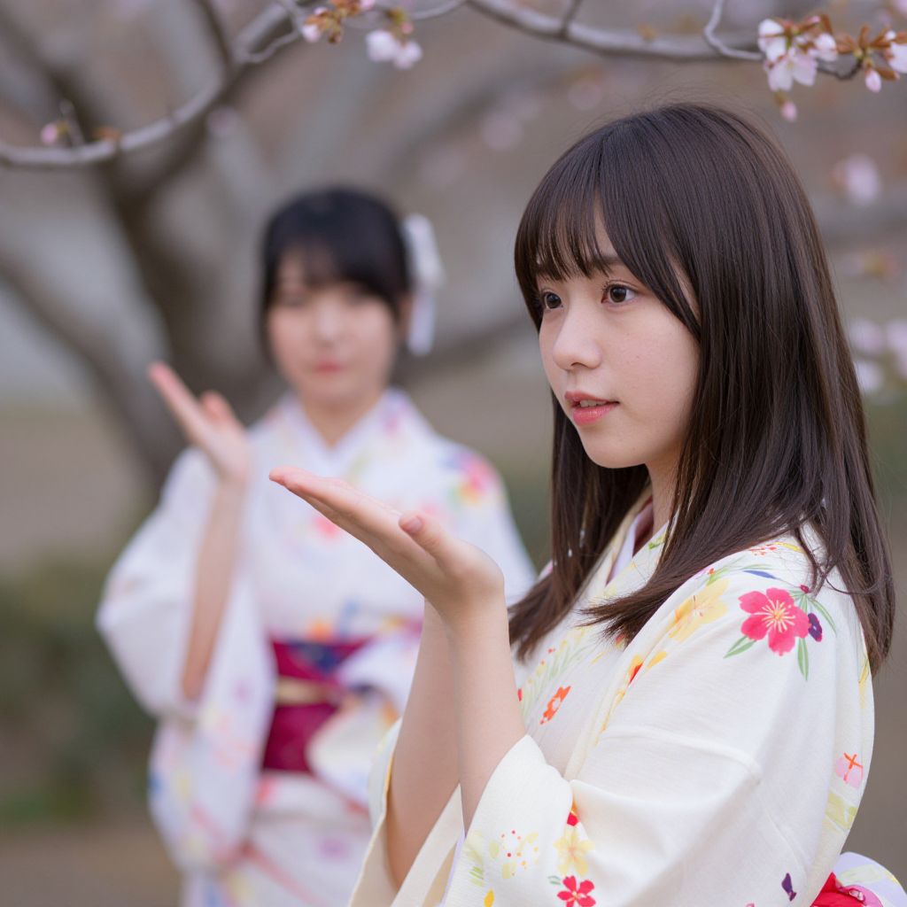 Photograph of an Asian woman with short black hair, wearing a white floral kimono, outdoors, extending her hands forward, with blurred tree branches in