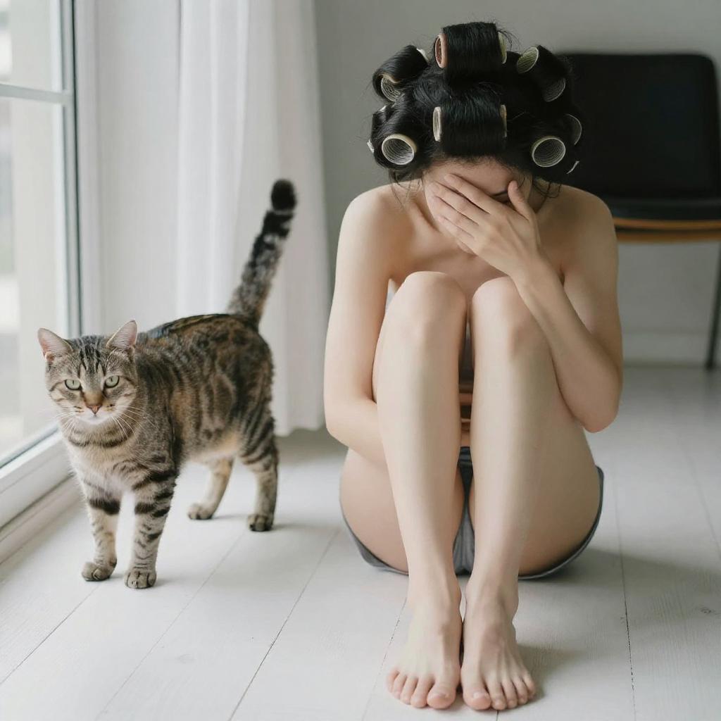 Photograph of a nude, light-skinned person with black hair in large curlers, sitting on a white wooden floor with legs spread. A gray tabby cat stands to the left, near a window with white curtains. The person's right hand covers their face, and a black chair is partially visible in the background.