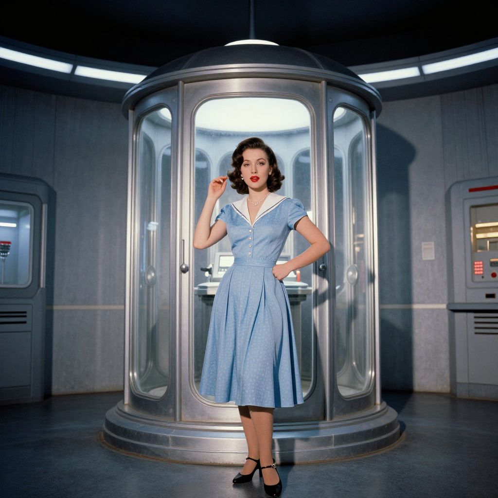 Photograph of a vintage-style woman standing inside a futuristic, metallic glass enclosure. She has fair skin, dark curly hair, and wears a light blue, short-sleeved, knee-length dress with a white collar and buttons, and black high-heeled shoes. Her red lipstick and poised stance evoke a 1950s pin-up look. The background features a circular room with metallic gray walls, illuminated by bright overhead lights and a control panel on the right. The overall aesthetic blends retro and sci-fi elements, creating a nostalgic futuristic ambiance.