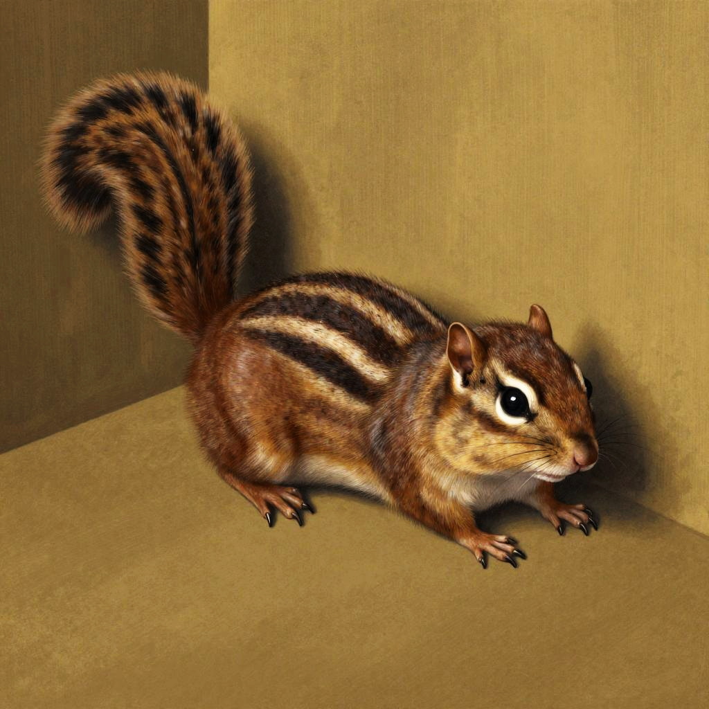 Illustration of an alert chipmunk, laying in the corner of a wall. Rendered in the style of rich chocolate brown and muted gold, influenced by Konstantinos Parthenis and Louis Majorelle, featuring surreal yet realistic textures and emotional depth.