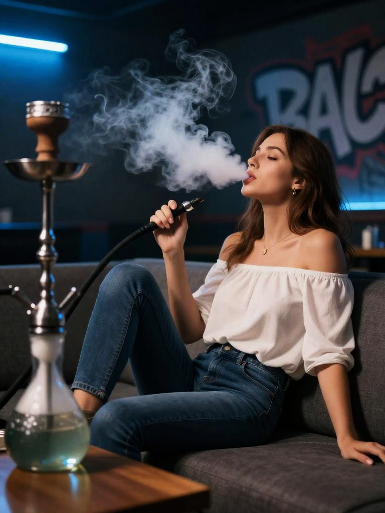 Woman smoking shisha, cozy indoor lounge, fair-skinned woman with chestnut hair falling over one shoulder reclining on a low sofa with crossed legs, holding a long shisha hose and exhaling a drifting cloud of smoke that partially covers her face, wearing off-shoulder blouse and skinny jeans, modern hookah bar interior with dimly lit walls with graffiti-style lettering, cool blue ambient lighting, cinematic lifestyle photography