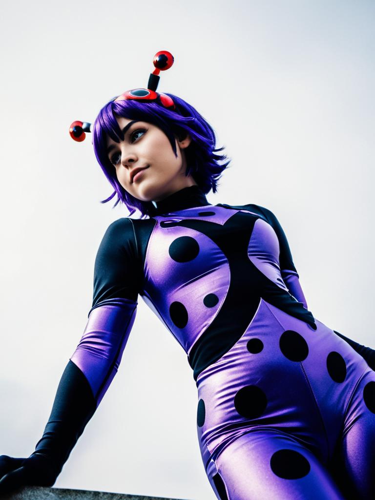 Person wearing Miraculous Ladybug Purple Costume, dramatic low-angle cosplay photo