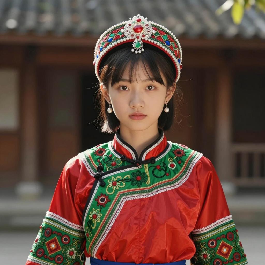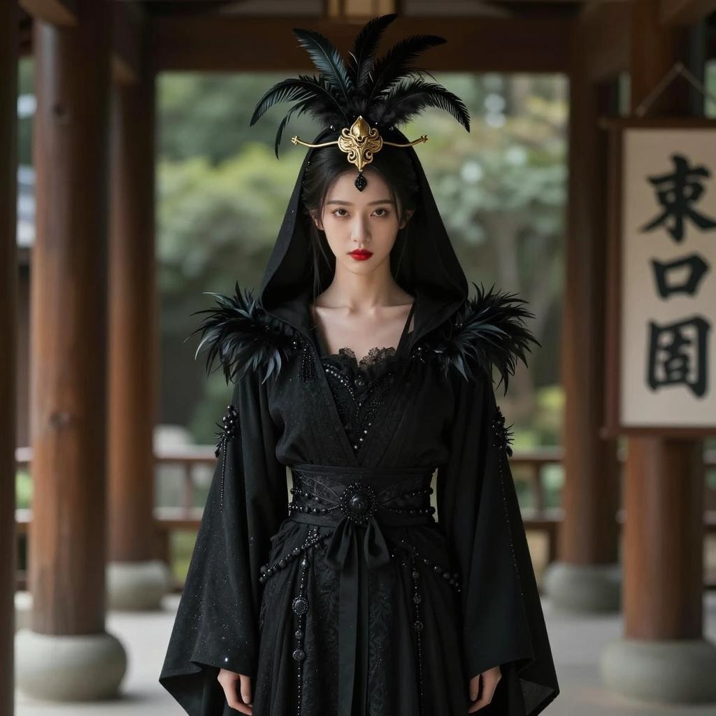 Red feather costume, photograph of a young woman wearing a vibrant red and white feather headdress, with red and black feathered chest piece, standing outdoors, daytime, shallow depth of field, background blurry, natural light, realistic style, symmetrical composition, focused on face, neutral expression, pale skin, dark hair pulled back, modern fashion, ethnic-inspired costume, feathers creating a halo effect, green trees and blurred buildings in background, high detail, sharp feathers, rich colors, feminine, strong presence