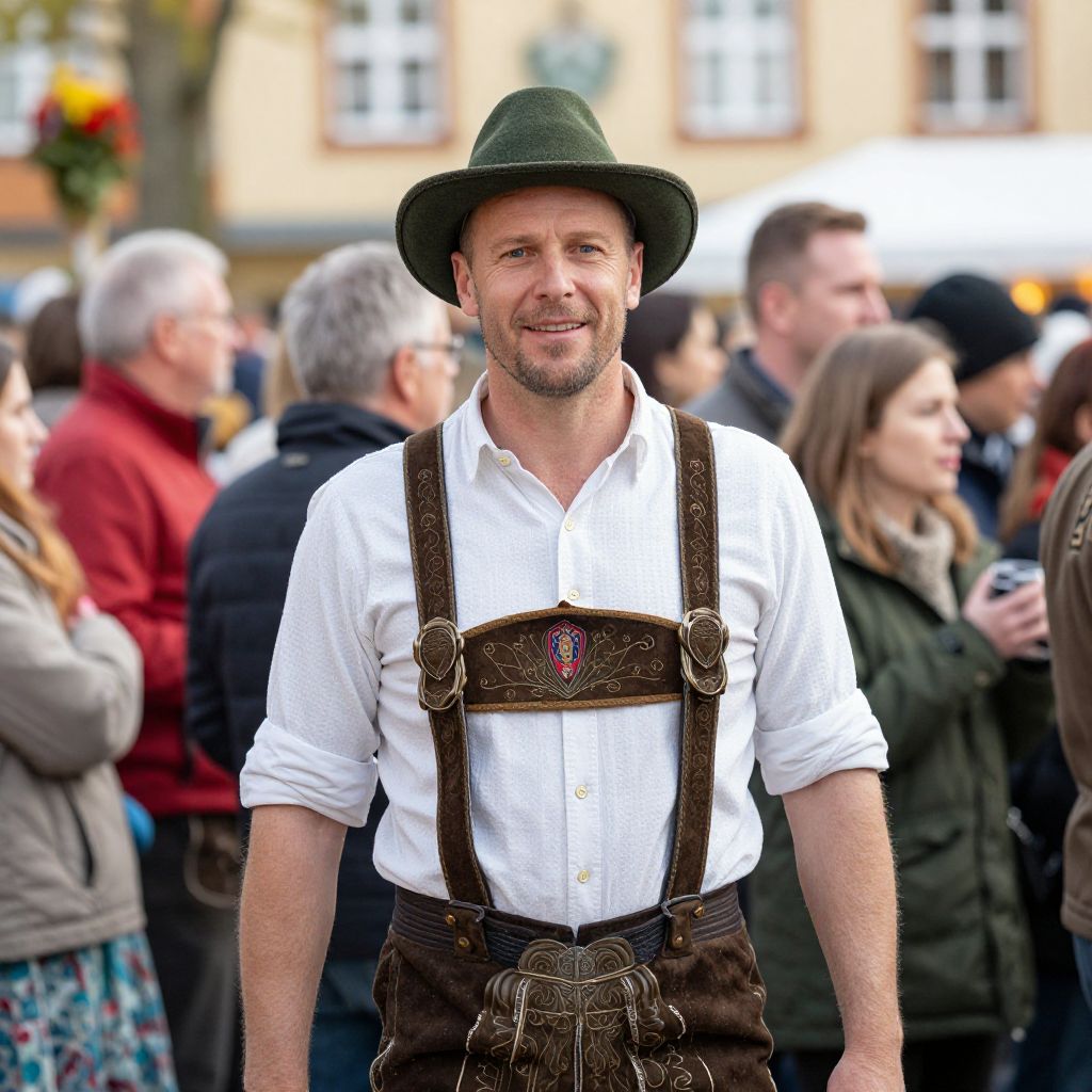 Photograph of a smiling middle-aged man with a green hat, white shirt, brown leather suspenders, and Bavarian-style pants, standing in a