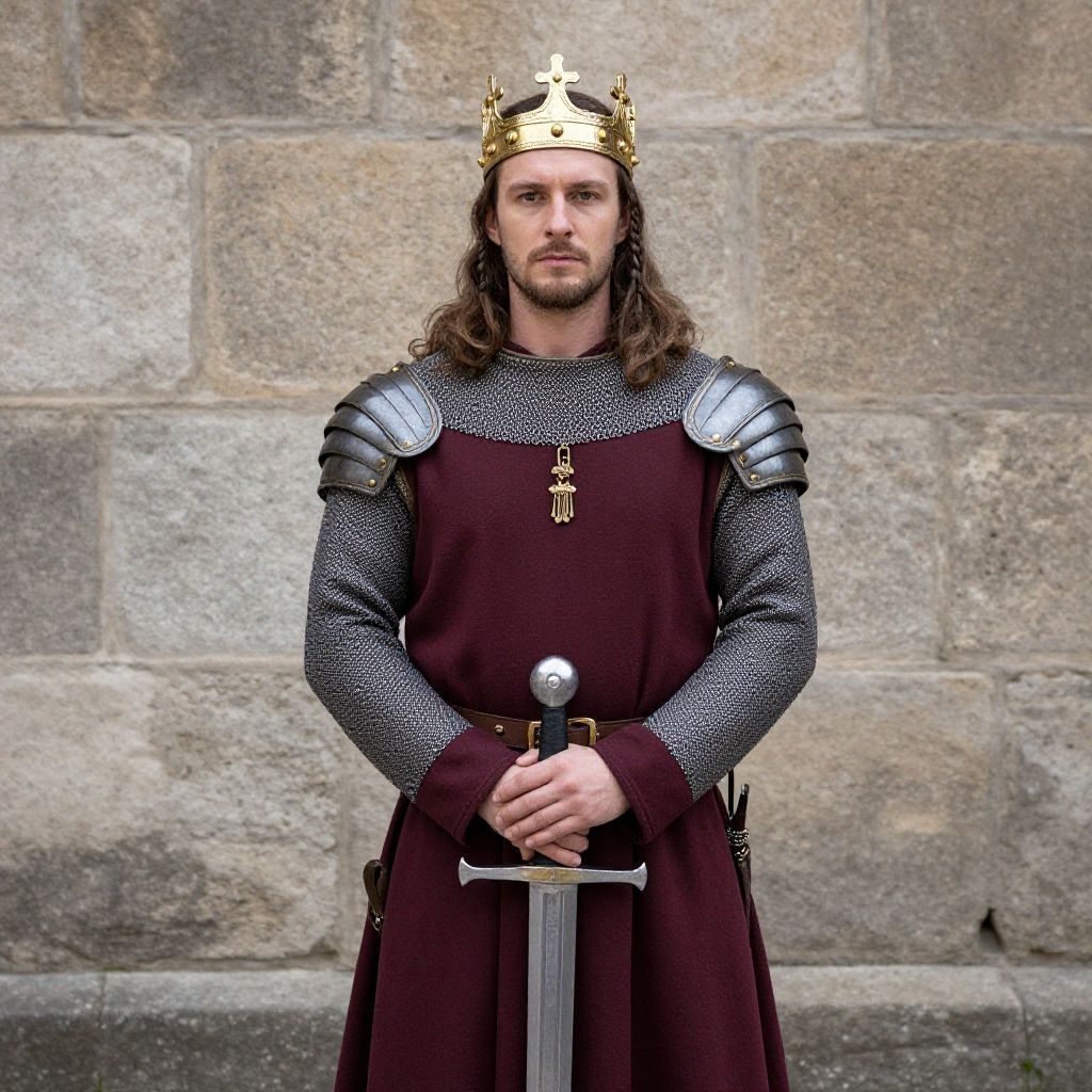 A man dressed as a medieval king stands confidently against a stone wall backdrop, wearing a golden crown and detailed armor with chainmail and a maroon tunic. His long hair is braided, and he holds a sword, embodying regal strength and historical authenticity in this realistic portrait.
