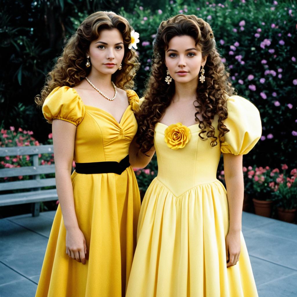 Portrait of two women with long curly brown hair wearing elegant yellow dresses. Both have floral-themed accessories, including a flower in one woman's hair and a rose on the other's dress. They are standing outdoors with a backdrop of greenery and blooming pink flowers, wearing jewelry such as pearl necklace and gold earrings.