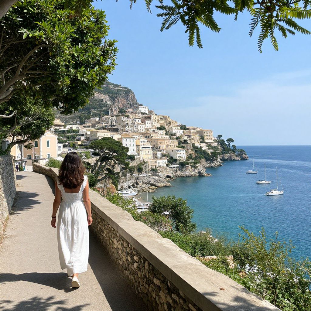 Lush green trees frame a serene coastal path where a woman in a flowing white dress walks along a stone wall, overlooking a picturesque Mediterranean town perched on rocky cliffs, with sailboats gently bobbing in the azure sea below.