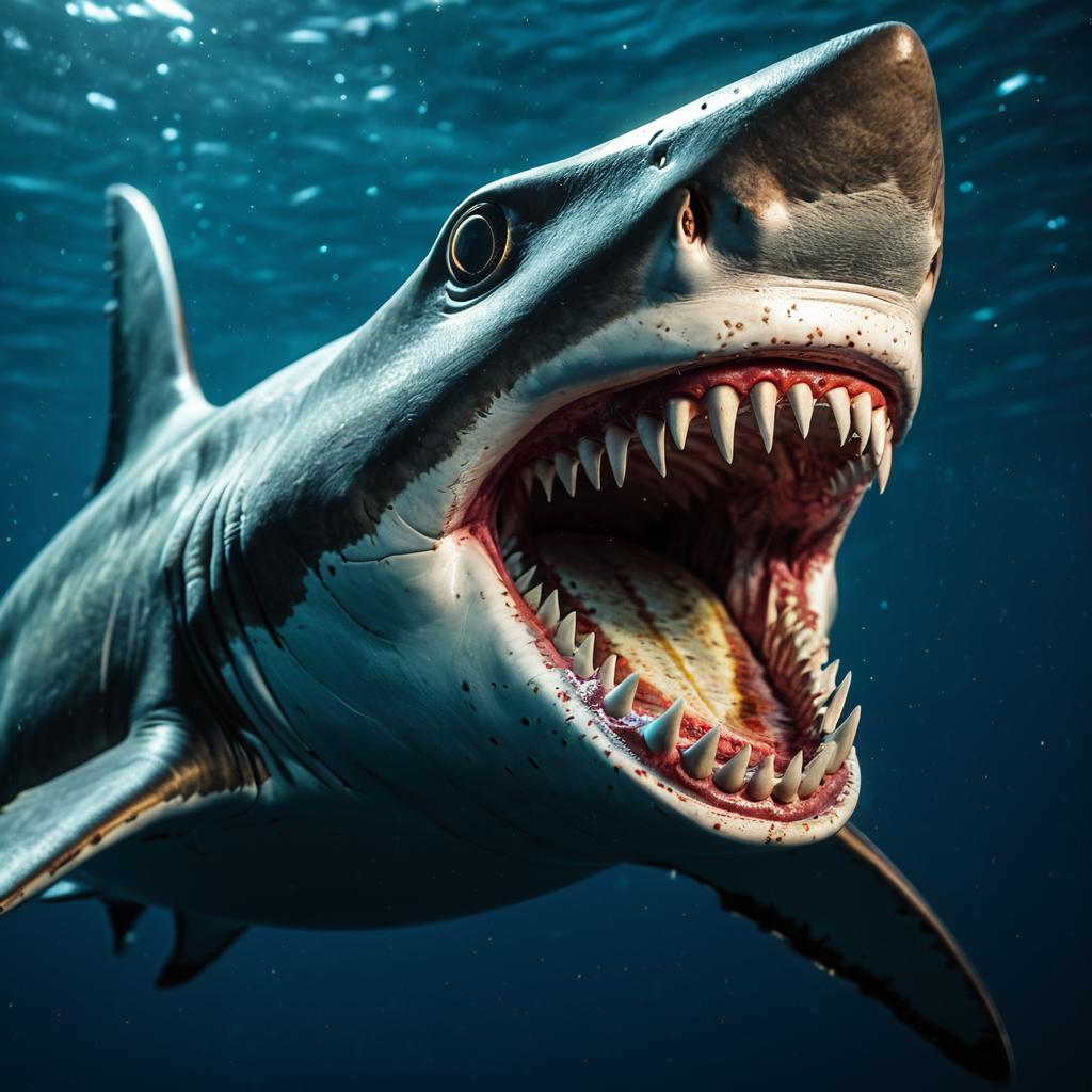 Hyperdetailed close-up image of a fictional lovecraftian horror monster shark with a wide open mouth showing 32 rows of sharp teeth. The shark is rendered with cinematic quality, intricate details, and beautiful color grading in an underwater setting. The image features dramatic rim lighting and depth of field effects, captured with ultra-wide angle perspective.