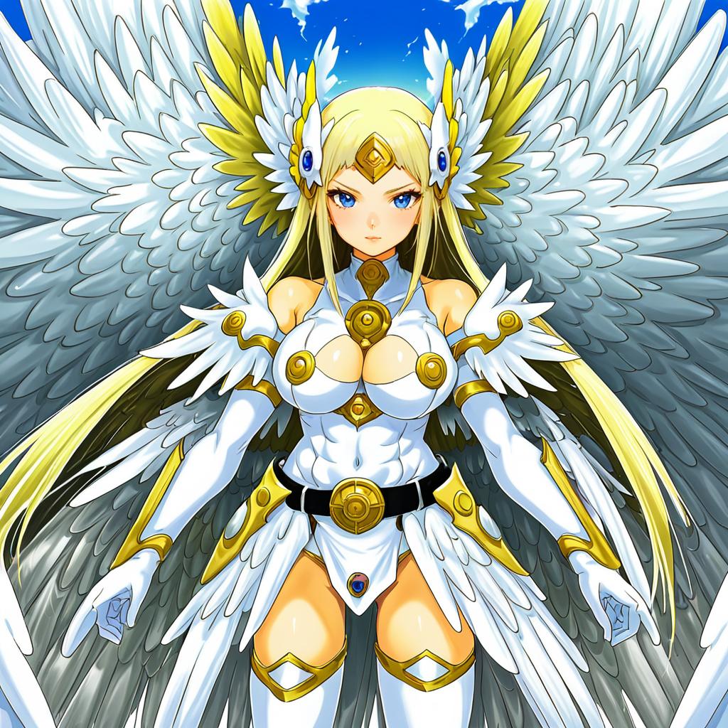 Angewomon, digimon, 1girl, angel wings, angel, angel wings, blonde hair, long hair, large breasts, cleavage, thigh strap, navel, winged helmet, asymmetrical clothes, white gloves, bare shoulders, belt, feathered wings, head wings, multiple wings, white wings, feathered wings, multiple wings, white wings, digimon (creature), hagoromo, by artist nima (niru54), anime