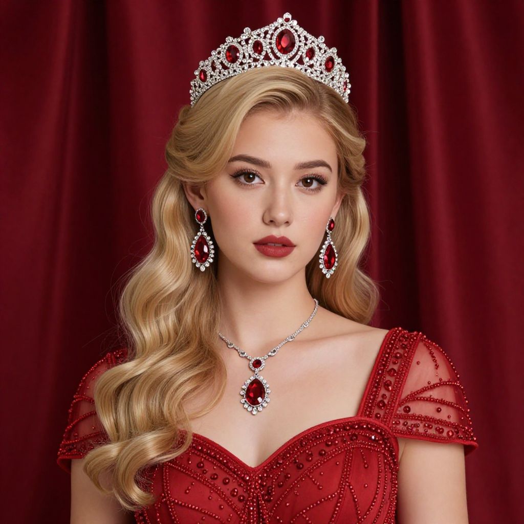 Photograph of a young woman with fair skin and long, wavy blonde hair adorned with a sparkling silver tiara. She wears a deep red, off-the-shoulder dress embellished with sequins and sheer fabric. Her makeup includes red lipstick, and she has red, diamond-shaped earrings and a matching necklace. The background is a rich, red velvet curtain that complements her attire. Her expression is calm and composed, and the lighting highlights her elegant features and the intricate details of her jewelry and dress.