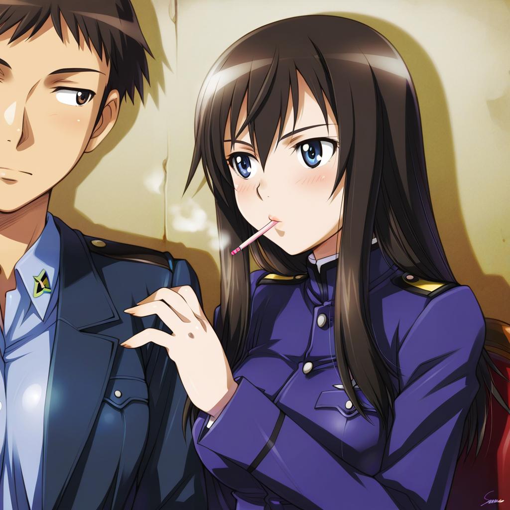 Elizabeth f. beurling, world witches series, 1girl, blue eyes, long hair, brown hair, black hair, cigarette, by artist sameha ikuya, illustrious