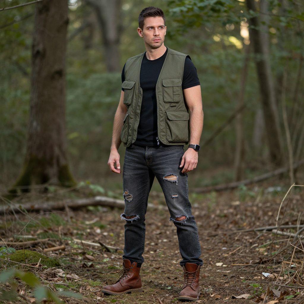 Photograph of a muscular, Caucasian man with short dark hair, wearing a green vest, black t-shirt, ripped jeans, brown boots, and a