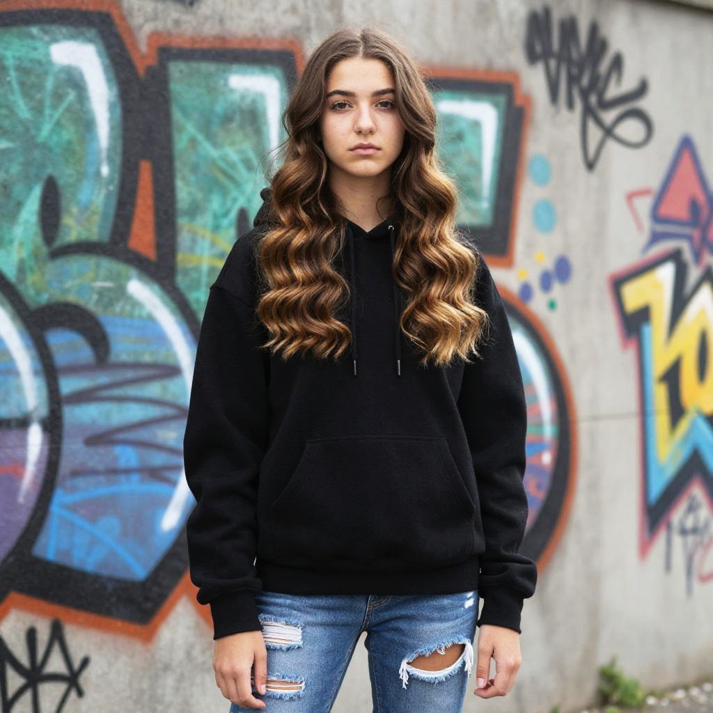 540 Waves hairstyle on female teenager, wearing hoodie and ripped jeans, in graffiti wall, captured in fashion editorial style with overcast natural light.