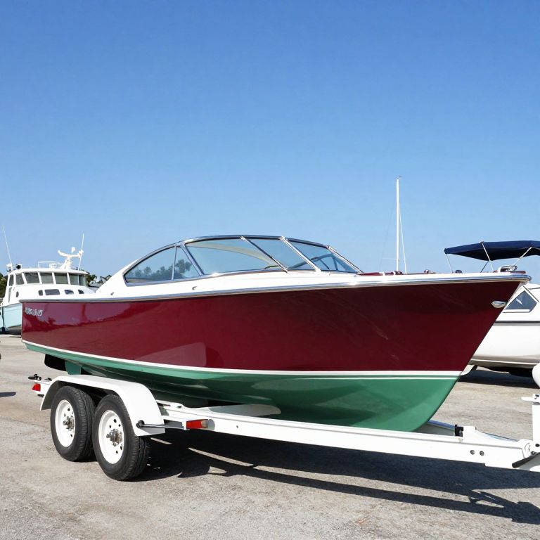 A vibrant 1956 18-foot Chris Craft Continental boat, painted in rich maroon with green trim, rests on a white trailer at a marina, surrounded by other docked vessels under a clear blue sky.