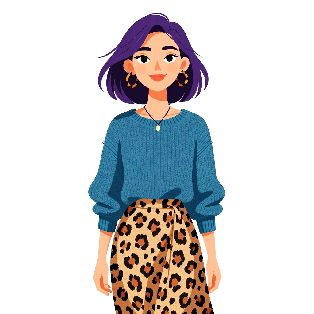 Digital illustration of a young woman with straight brown hair, wearing a purple turtleneck, blue cuffed jeans, and brown boots, standing against a