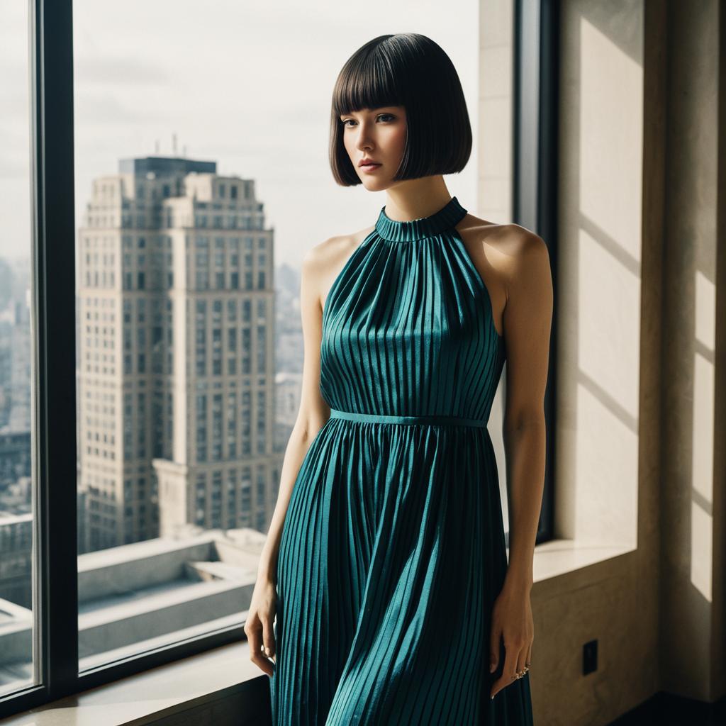 Long Bowl Cut hairstyle on female model, wearing casual denim jacket, in urban alley, captured in fashion editorial style with soft golden hour glow.