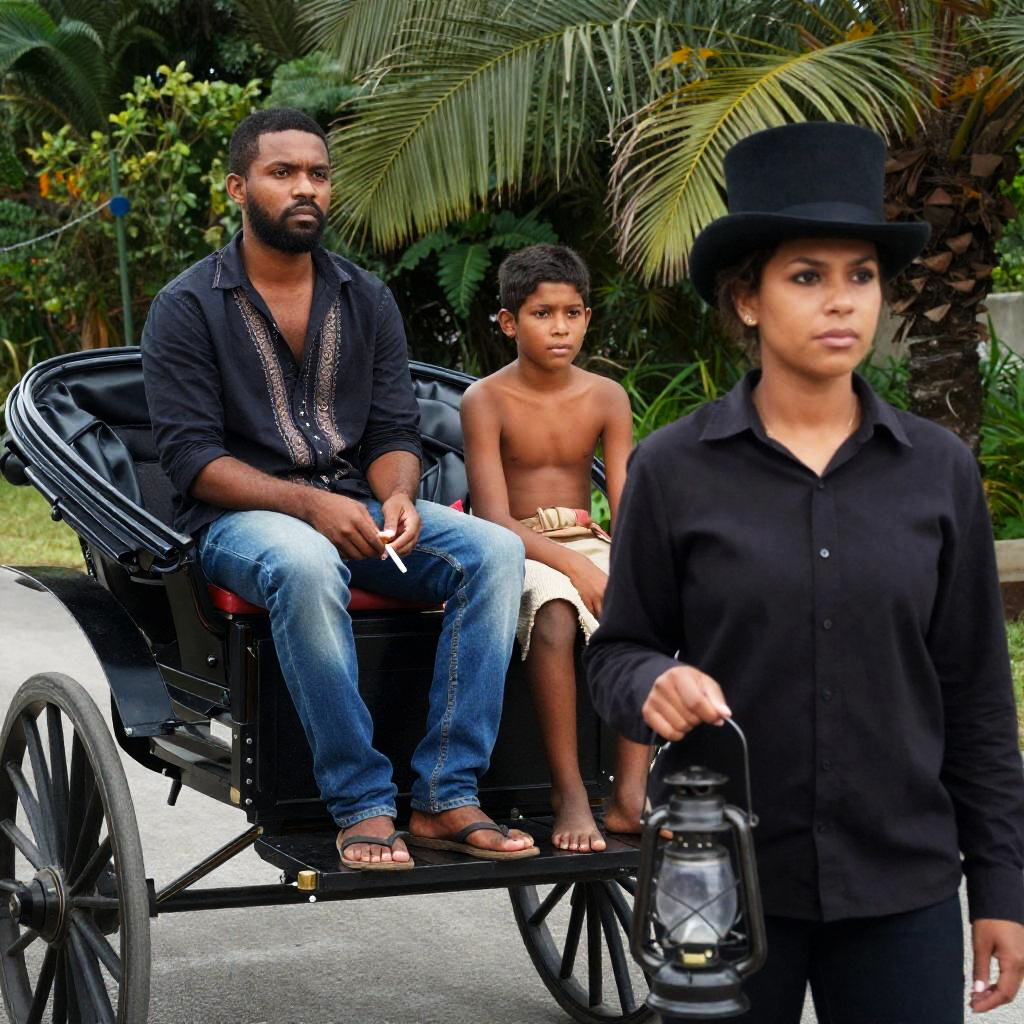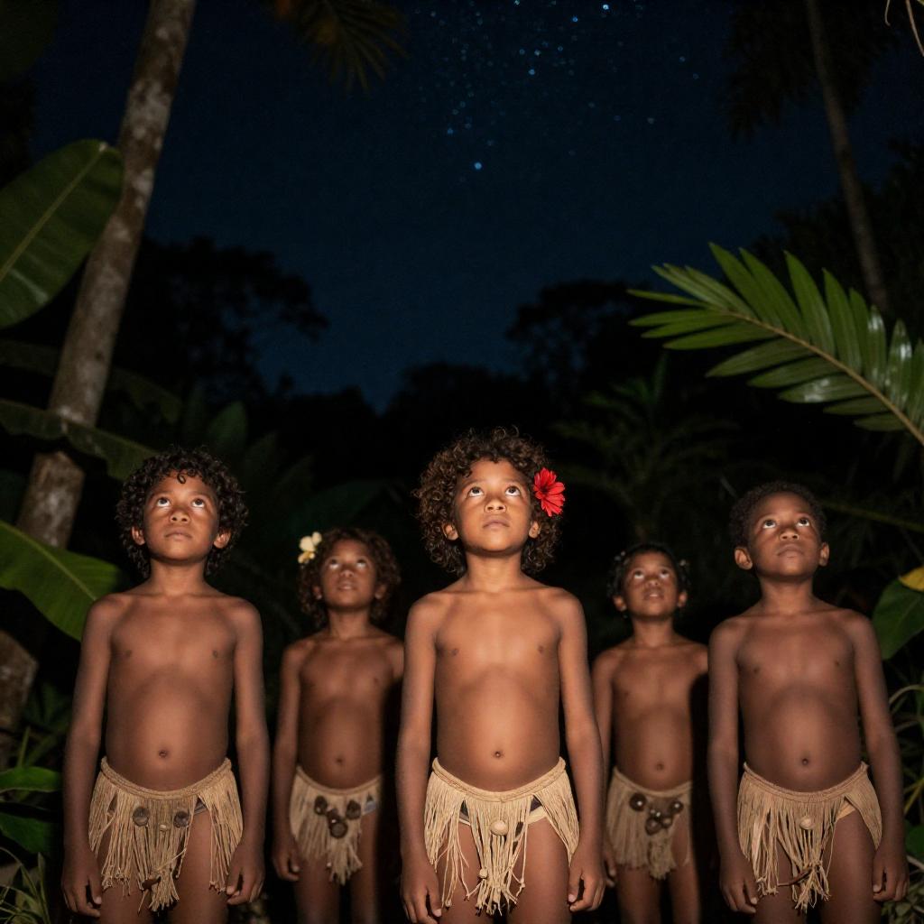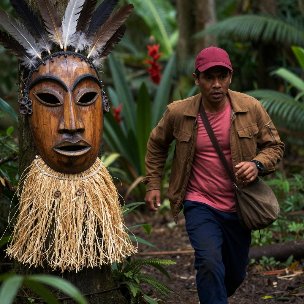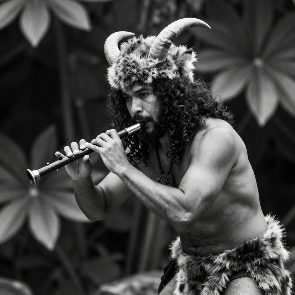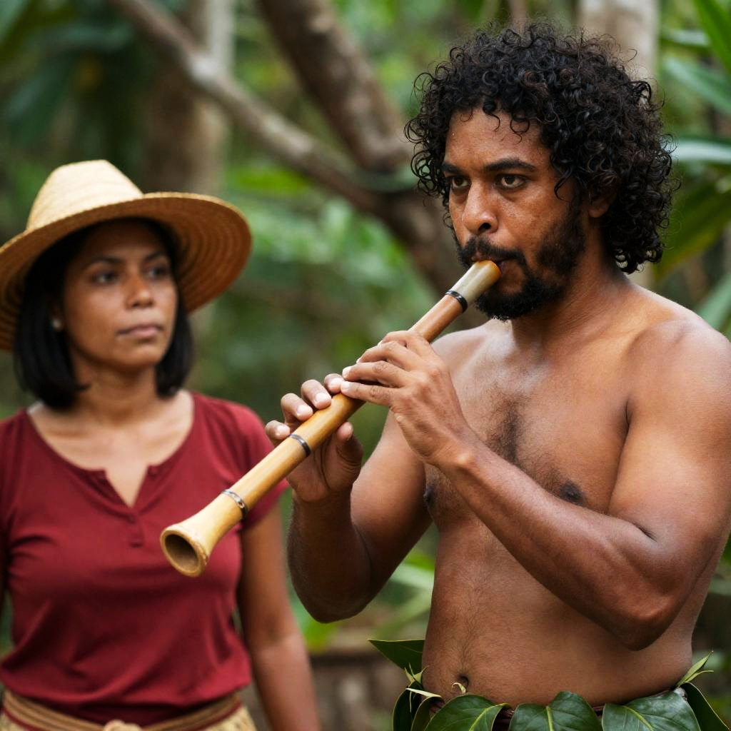 Photograph of two people in a jungle setting. A shirtless man with curly hair and a beard, wearing a leaf loincloth, plays a bamboo flute. A woman with short dark hair, wearing a red shirt and straw hat, looks at him. Background includes greenery and tree branches. Man's intense gaze, woman's focused expression.