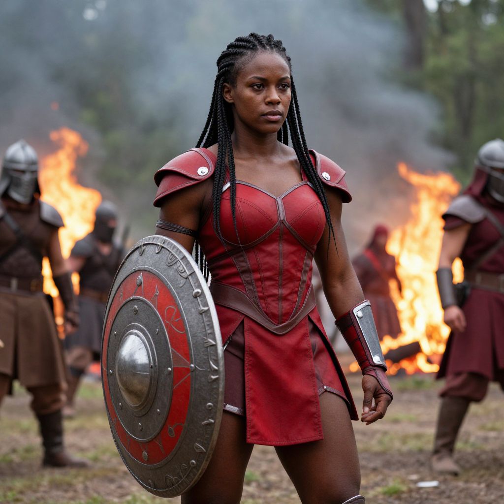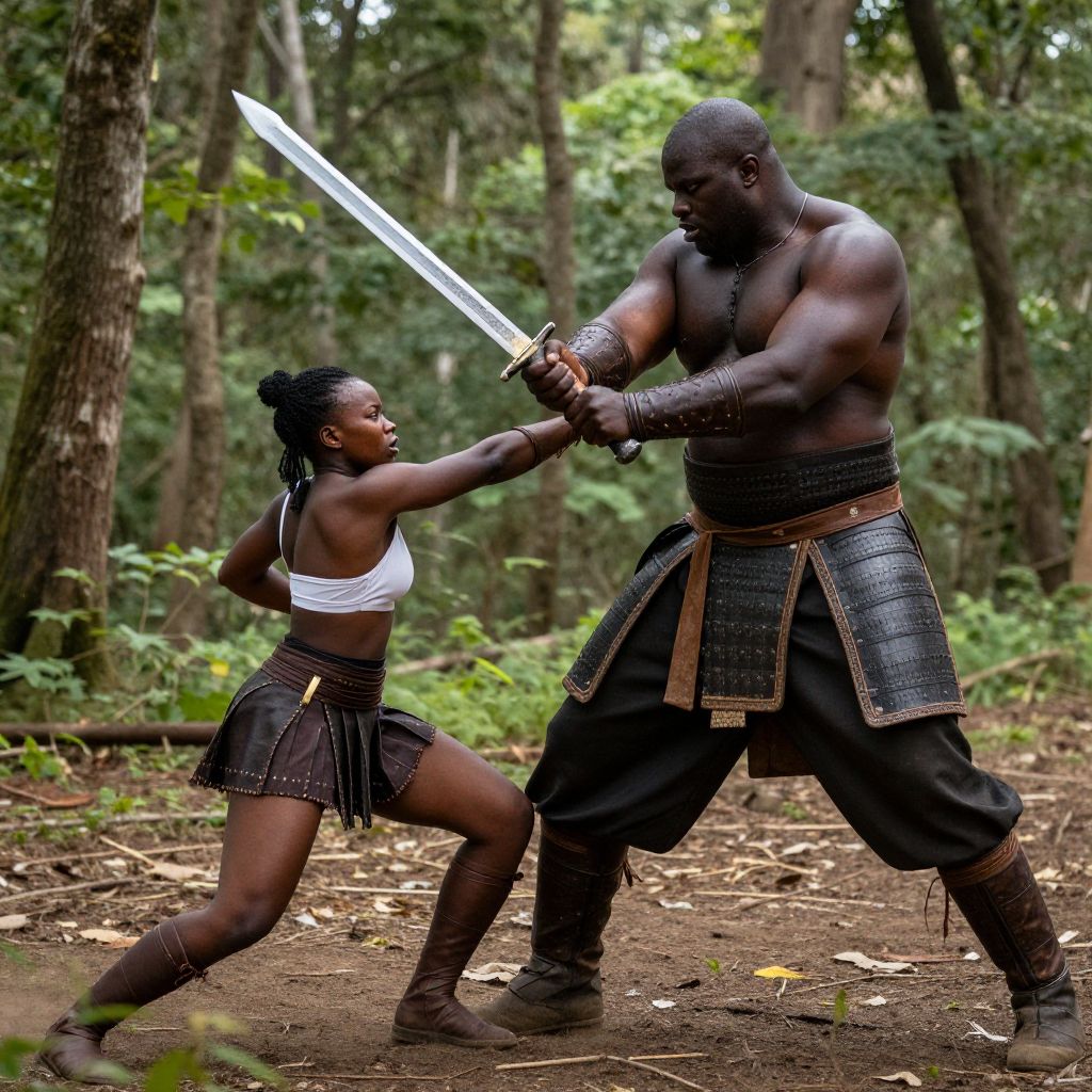 Two skilled warriors, one tall and muscular African warrior with a sword, and a smaller, agile black woman, engage in a fierce battle in a dense forest, with the woman countering the man's attack and knocking him back.