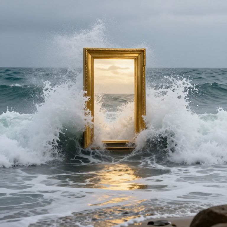 Photograph of a large, empty golden picture frame emerging vertically from the ocean waves, with white sea foam splashing around it. The frame has a bright, glowing light from within, reflecting on the water's surface. The ocean is dark blue, and the sky is overcast with gray clouds. The frame's golden color contrasts with the blue and white of the sea. The image conveys a surreal, dreamlike quality with its unexpected juxtaposition of a classical art frame and the natural, turbulent ocean.