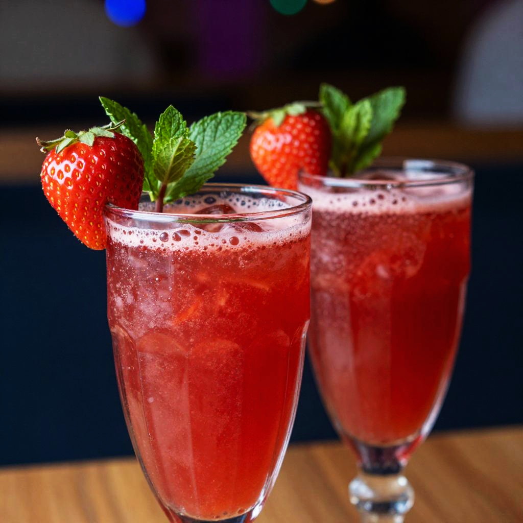 Close-up photograph of a vibrant red strawberry with green leaves, glistening with water droplets, resting on a rimmed red liquid surface.
