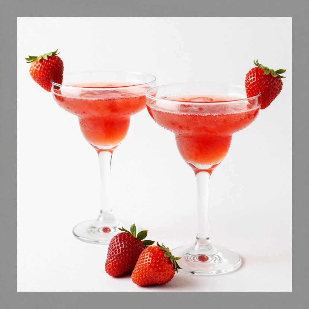 Close-up photograph of a vibrant red strawberry with small water droplets on its surface, resting in a shallow, glossy red liquid. The strawberry's green leaves are fresh and slightly curled. The liquid's edge is decorated with sparkling sugar crystals. The background is white, making the bright red colors of the strawberry and liquid stand out. The image is highly detailed, emphasizing the texture of the strawberry's skin and the reflective quality of the liquid.