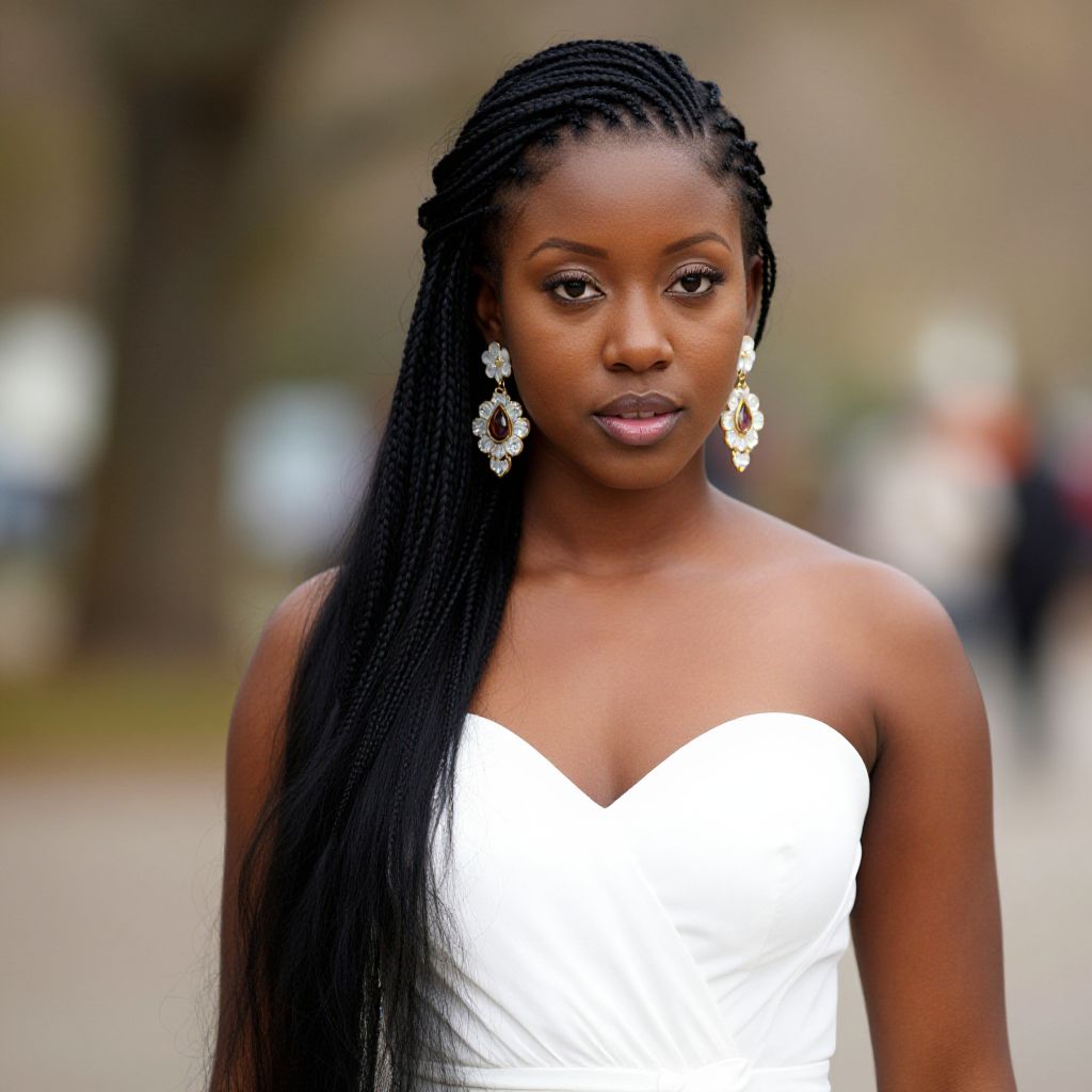 Photograph of a beautiful Black woman with long braids, wearing a strapless white dress and elegant diamond earrings, standing outdoors.