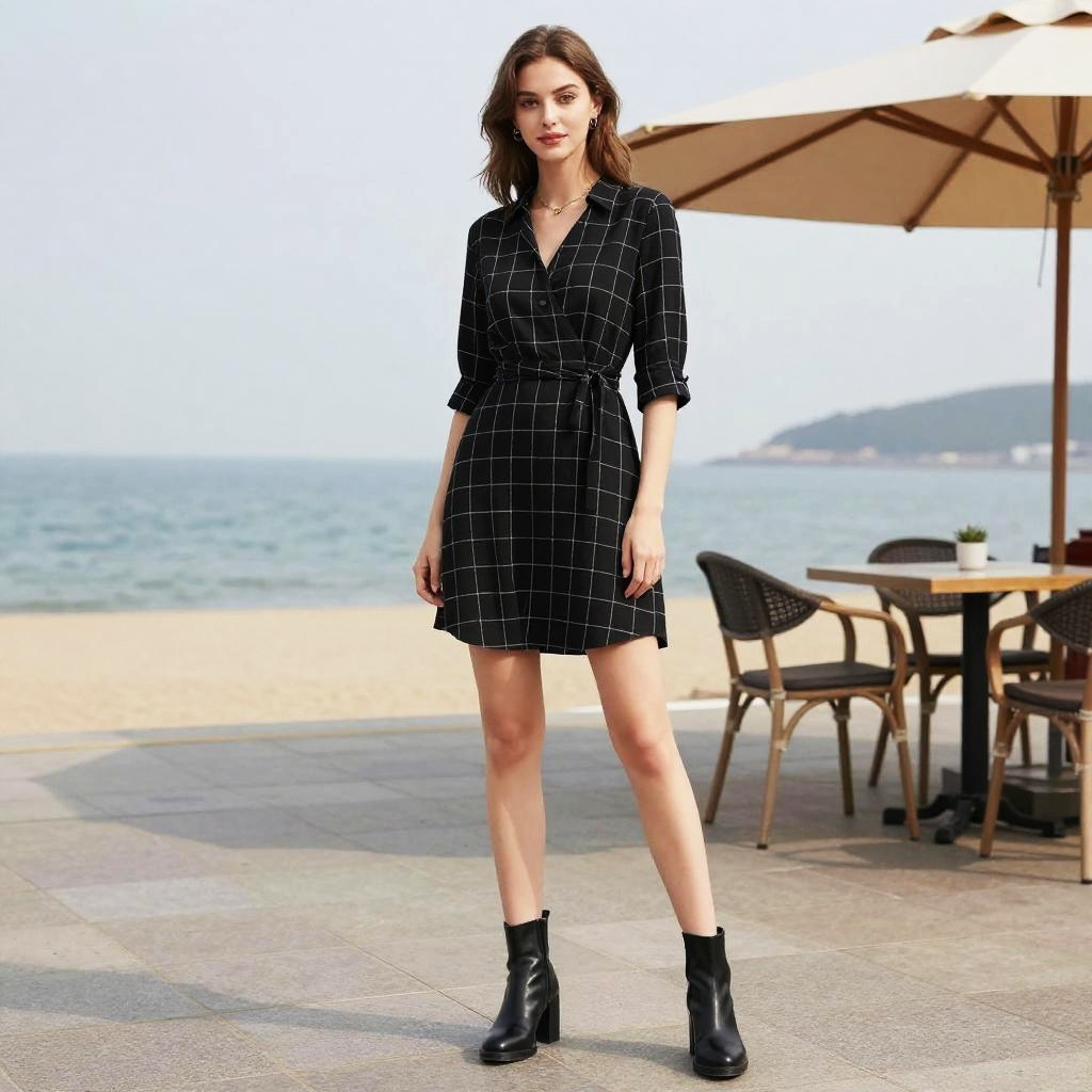 A lean woman with fair skin and brown hair stands confidently on a seafront promenade. She is wearing a casual chic V-neck black shirtdress with a white grid pattern and three-quarter length roll-tab sleeves. The dress is paired with black ankle boots that have chunky heels. The setting includes outdoor café tables and chairs with beige umbrellas, with a sandy beach and calm sea in the background.